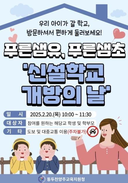 (아름다운교육신문) 경기도동두천양주교육지원청은 오는 2월 20일 10시부터 11시 30분까지 2025년 3월 개교 예정인 푸른샘유·푸른샘초 ‘신설학교 개방의 날’ 행사를 개최한다고 밝혔다.