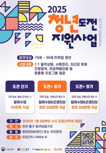 (아름다운교육신문) 인천시 중구는 구직을 단념한 ‘그냥 쉬는 청년’들의 자신감 회복과 적극적인 취업시장 참여를 위해 ‘2025년 청년도전지원사업’을 추진하고, 참여자를 모집한다고 18일 밝혔다.