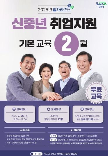(아름다운교육신문) 남양주시는 2월 26일부터 중장년층(40~65세) 구직자를 대상으로 ‘2025년 신중년 취업 지원 교육’을 운영한다고 19일 밝혔다.