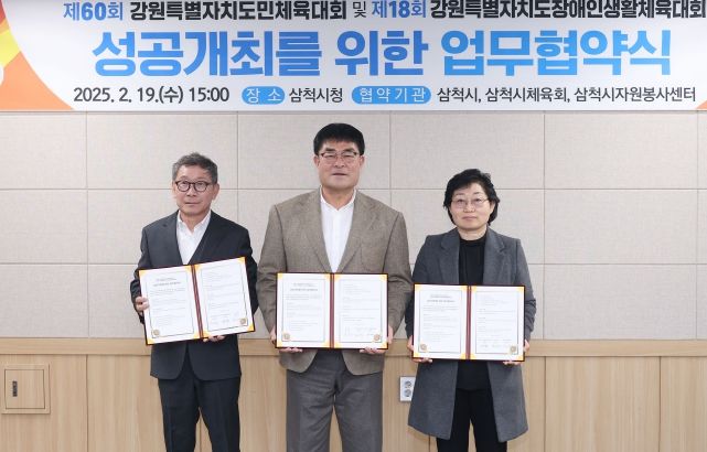 (아름다운교육신문) 삼척시가 2월 19일 삼척시체육회, 삼척시자원봉사센터와 제60회 강원특별자치도민체육대회 및 제18회 강원특별자치도장애인생활체육대회의 성공개최를 위한 업무협약을 체결했다.