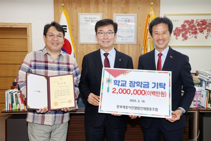 (아름다운교육신문) 충청북도교육청이 충북세종사진앨범인쇄협동조합(이사장 장광동)으로부터 장학금 200만 원을 전달받고 교육감실에서 전달식을 가졌다.