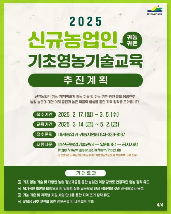(아름다운교육신문) 예산군농업기술센터가 신규농업인의 성공적인 영농 정착 지원을 위한 ‘신규농업인 기초영농기술교육’ 교육생을 3월 5일까지 모집한다.