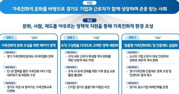 경기연구원은 제도 정착과 안정적인 운영을 위해서는 가족친화 문화를 바탕으로 하는 환경 조성이 우선이라며 9개 세부 실천과제를 제안했다. 바로 ▲경기 가족친화인증제도 프리미엄화 ▲가족친화 리더 기업 네트워크 ▲직장 내 찾아가는 가족친화교육 다면화 ▲‘리프레시 제도’ 및 ‘0.5·0.75잡 제도’ 확산 ▲조직 내 가족 중심 교류활동 활성화 ▲‘경기도 돌봄기회 지원금’ 추진 ▲소규모 기업 인센티브 강화 ▲경기 가족친화인증제도 항목 조정 및 인센티브 제고 ▲‘경기도 중소기업 대체인력풀’ 운영이다.
