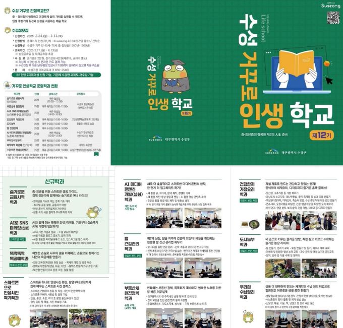 (아름다운교육신문) 대구 수성구는 2월 24일부터 다음 달 13일까지 중장년층의 인생 제2막 꿈과 도전을 지원하는 ‘제12기 수성 거꾸로 인생학교’ 수강생을 모집한다.