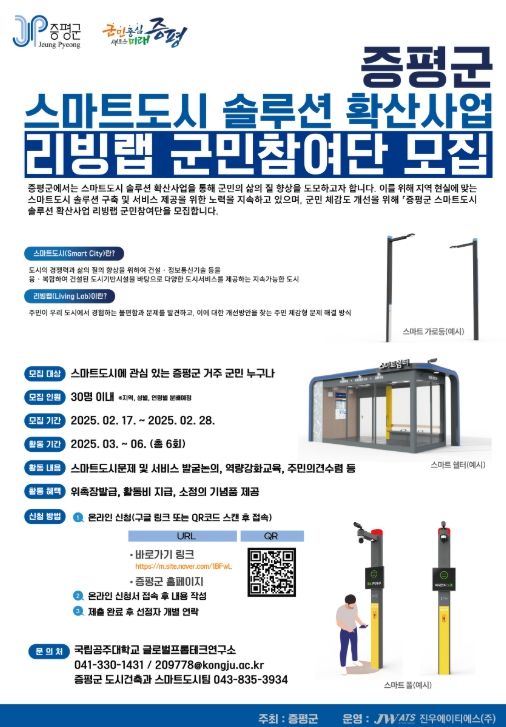 (아름다운교육신문) 충북 증평군이 스마트도시 솔루션 확산사업 리빙랩 군민 참여단을 이달 28일까지 모집한다.
