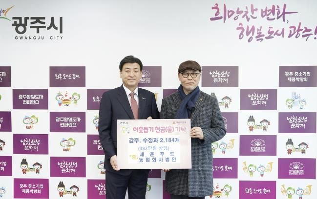 20일 시에 따르면 지난 19일 세준푸드 문완기 대표와 일신산업전기 고수영 대표는 광주시청을 방문해 어려운 이웃을 위해 사용해 달라며 성금과 성품을 전달했다.