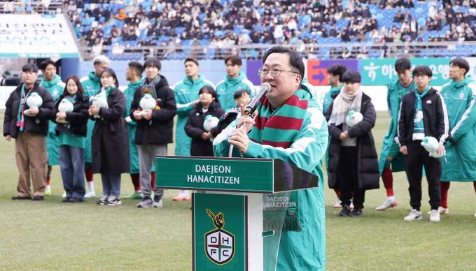 (아름다운교육신문) 이장우 대전시장이 23일 2025 K리그1 대전하나시티즌 홈 개막전(상대팀 : 울산 HD FC)에 참석했다. 이장우 시장은 “홈 개막전에 맞춰 꿈돌이 굿즈 상품이 출시됐다”라면서 “시민 여러분의 많은 관심 부탁드린다”라고 당부했다. 그러면서 이번 시즌이 하나시티즌이 일류 축구 도시 대전의 새 역사를 쓰는 한 해가 되기를 응원한다”라고 말했다.