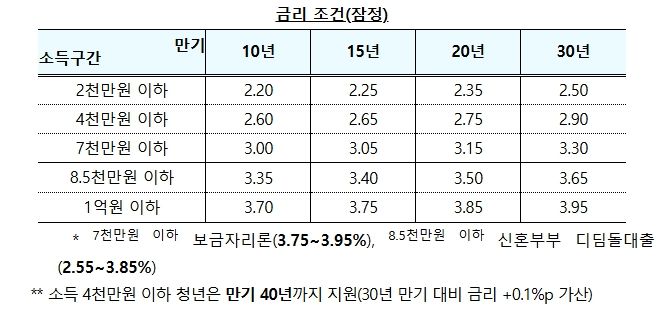 아울러 생애최초 구입 등 약 10여종의 다양한 우대금리를 통해 최저 1%p대까지 금리가 낮아져 시중금리와 차이가 커진 점을 고려하여, 우대금리에는 적용 상한(0.5%p)과 적용 기한(자금별 4~5년)을 설정한다.