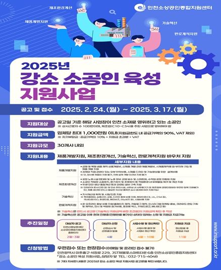 (아름다운교육신문) 인천광역시는 소공인의 안전하고 쾌적한 근무환경을 개선하고, 안정적인 제품 개발과 홍보 확산을 지원하기 위해 ‘2025년 강소 소공인 육성 지원사업’을 추진한다.