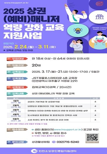 (아름다운교육신문) 인천광역시는 지역 상권의 경쟁력을 강화하고 체계적인 상권 관리를 위한 ‘상권 (예비)매니저 역량 강화 교육’을 실시한다고 밝혔다.