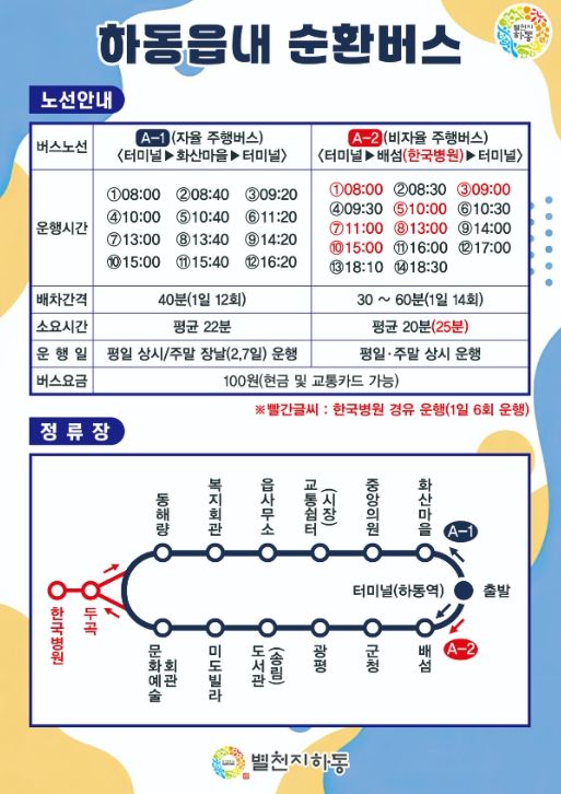 읍내 순환버스는 하동버스터미널에서 양방향 2개 노선으로 운행된다.