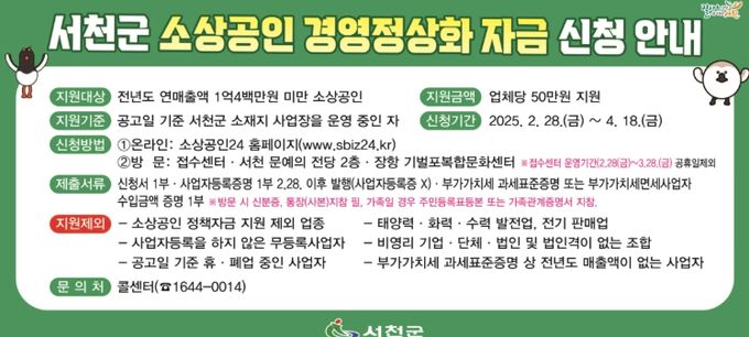 지원 대상은 전년도 연매출 1억 400만원 미만의 소상공인으로, 공고일 기준 서천군에서 사업장을 운영 중인 사업자다.