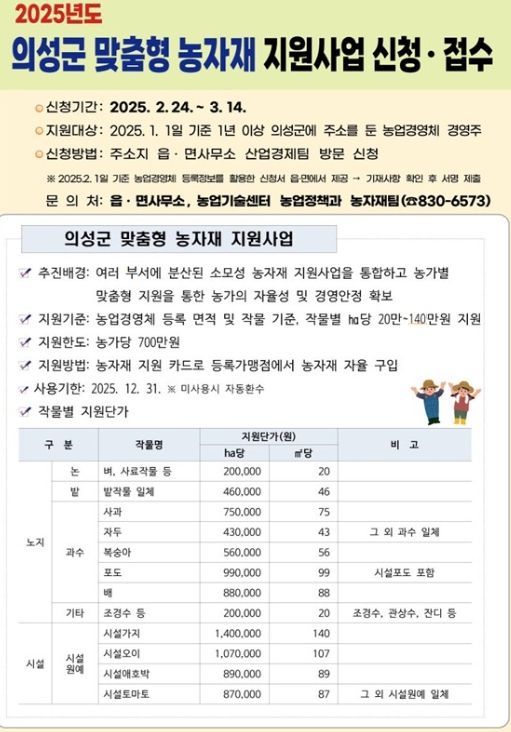 (아름다운교육신문) 의성군은 2025년 의성군 맞춤형 농자재 지원사업 신청을 2월 24일(월)부터 3월 14일(금)까지 실시한다고 밝혔다.