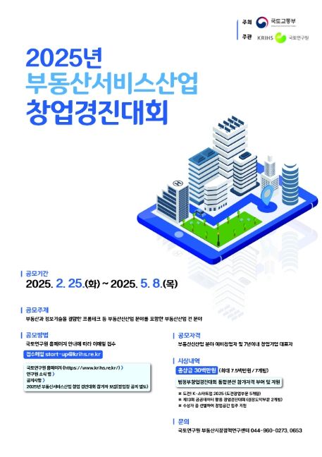 (아름다운교육신문) 국토교통부는 부동산과 프롭테크(Prop Tech) 분야 최신 정보기술을 결합한 부동산서비스산업 분야 새싹기업을 지원하기 위해 '2025 부동산서비스산업 창업경진대회'의 참가자를 2월 25일부터 모집한다고 밝혔다.