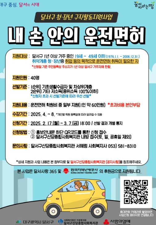 (아름다운교육신문) 달서구는 3월부터 취업을 준비하는 저소득 취약계층 청·장년 40명을 대상으로 자동차 운전면허 취득을 지원하는 '내 손 안의 운전면허' 사업을 추진한다.