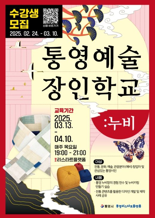 (아름다운교육신문) 통영시는 통영리스타트플랫폼에서 전통 누비의 가치를 배우고, 현대적인 디자인과 브랜드화까지 탐구하는 '통영예술장인학교 : 누비'의 수강생을 2월 24일부터 3월 10일까지 모집한다고 밝혔다.