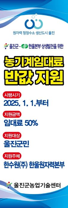 농기계임대사업소에서 농기계 임대 시 자동 감면되며 한수원 50%, 정부 25% 지원으로 최대 75%까지 울진군 농업인이라면 누구나 지원받을 수 있다.
