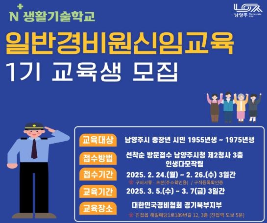 1기 교육은 3월 5일부터 7일까지 3일간 진행되며, 수료 후 아파트·건물 경비, 공공기관, 시설 경비 등 다양한 분야로 취업이 가능하다.