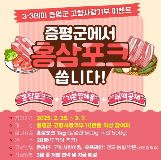 군 관계자는 “이번 이벤트는 삼겹살데이를 기념해 증평뿐 아니라 증평의 홍삼포크를 널리 홍보하고자 준비했다”며, “고향사랑기부에 동참하셔서 맛있는 삼겹살도 즐기고 세액공제와 답례품을 동시에 받는 1석 3조의 혜택을 누리시길 바란다”고 말했다.