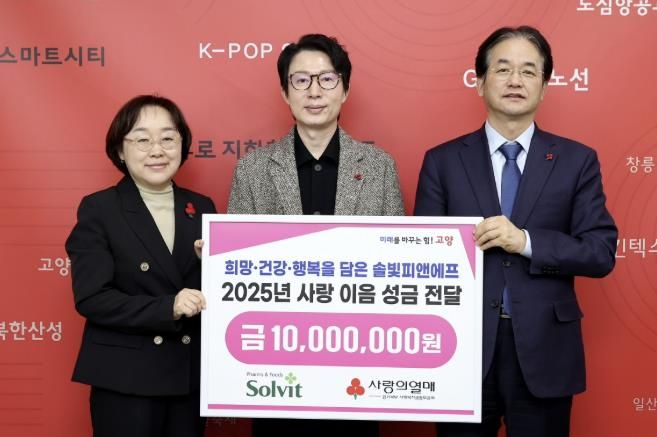 이날 전달식에는 이동환 고양특례시장을 비롯해 ㈜솔빛피앤에프 손원록 대표이사, 이경아 사회복지공동모금회 경기북부사업본부 본부장 등 10명이 함께 했다.