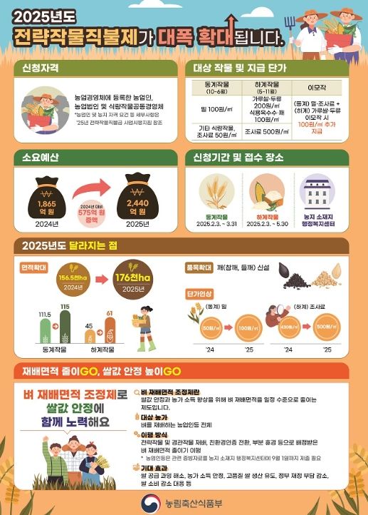 동계작물은 작년 가을 파종하여 ~ 봄에 수확하는 보리, 밀, 조사료 등이며 하계작물은 올해 봄에 파종하여 부터 가을에 수확하는 두류, 가루쌀, 하계 조사료 등이 대상으로, 품목에 따라 ha당 최대 500만원의 직불금을 지원한다.