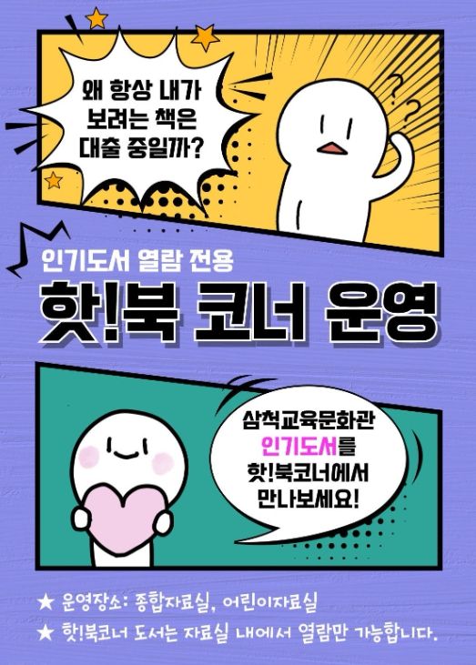 (아름다운교육신문) 삼척교육문화관은 오는 3월부터 종합자료실과 어린이자료실에서 인기도서 열람 전용 코너인 ‘핫!북코너’를 운영한다.