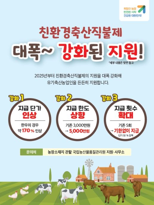 (아름다운교육신문) 농림축산식품부 국립농산물품질관리원은 3월 4일부터 친환경축산물(유기축산물) 인증을 받은 축산 농가를 대상으로 2025년도 친환경축산직불금사업 신청을 받는다.