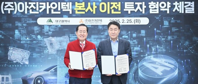 (아름다운교육신문) 대구광역시는 2월 25일 오전 11시 대구광역시 산격청사에서 ㈜아진카인텍(대표 서중호)과 수성알파시티 내 ‘본사 및 ABB*기반 차세대 기술연구소 이전’을 위한 투자협약을 체결했다.