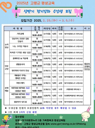 (아름다운교육신문) 고령군은 2월 25일부터 3월 5일까지 2025년 상반기 평생교육 정기강좌 수강생을 모집한다.