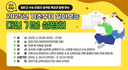 (아름다운교육신문) 광진구가 다음 달 14일, 학생 및 학부모를 대상으로 ‘2025년 기초부터 알아보는 대입 기본 설명회’를 개최한다.