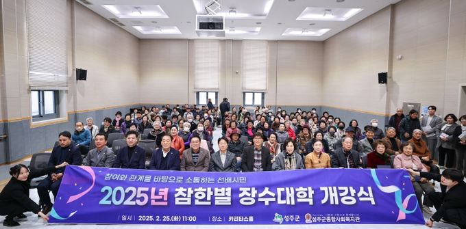 (아름다운교육신문) 성주군종합사회복지관(관장 박용찬)은 2월 25일 복지관 대강당에서 이병환 성주군수를 비롯한 성주군의회 의원, 장수대학생 등 120여명이 참석한 가운데 '2025년 참한별 장수대학 개강식'을 가졌다.