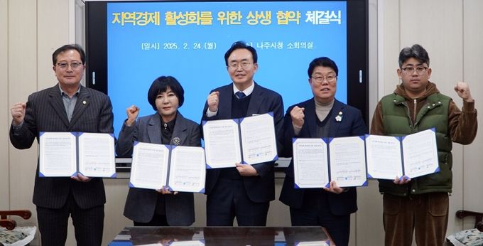 전라남도 나주시는 지난 24일 나주시의회, 한국외식업중앙회·대한미용사회 나주시지부, 공공배달앱 먹깨비 대표 관계자와 ‘지역경제 활성화를 위한 상생 협약식’을 가졌다고 25일 밝혔다.