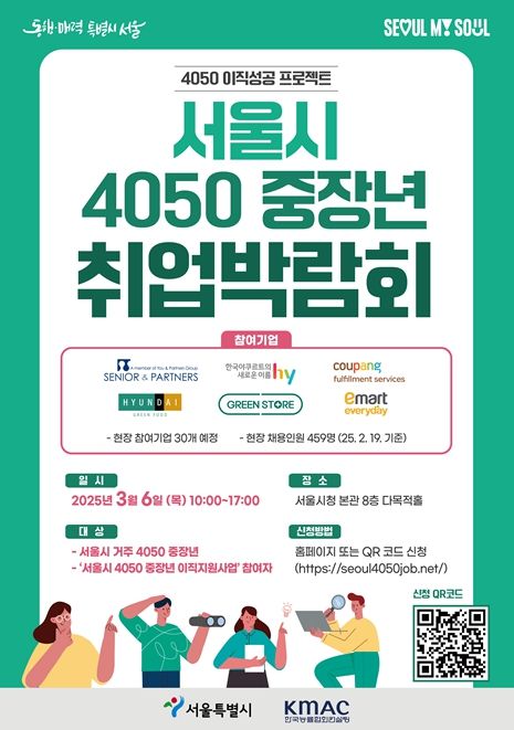 서울시는 3월 6일 시청 본관 8층 다목적홀에서 ‘2025 서울시 4050 중장년 취업박람회’를 개최한다고 밝혔다. 인구절벽의 시대, 주요 경제활동인구인 중장년 세대의 인생 전환기를 지원한다는 취지다.