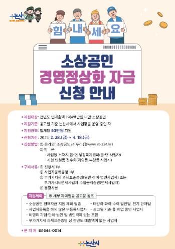 지원대상은 공고일 기준 논산시에 사업장을 운영 중이면서 지난해 매출액이 1억 4백만원 미만 업체로, 업체당 50만원을 지급할 예정이다.