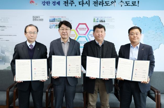 시와 전북신용보증재단, 전북은행, 전주시소상공인연합회는 26일 전주시장실에서 우범기 전주시장과 한종관 전북신용보증재단 이사장, 오현권 전북은행 부행장, 유장명 전주시소상공인연합회장 등이 참석한 가운데 ‘2025년 전주 희망더드림 특례보증 지원사업 업무협약’을 체결했다.