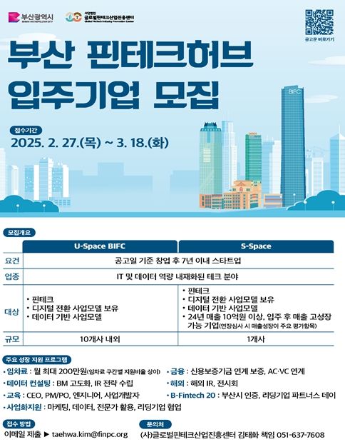 시는 이번 모집을 통해 본격적으로 부산이 금융기술(핀테크) 혁신의 중심지로 자리매김할 수 있도록 역량 있는 신생기업(스타트업)을 적극 발굴해 지원할 계획이다.