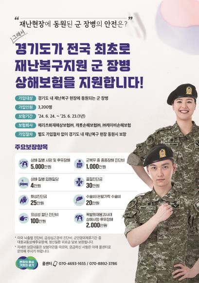 (아름다운교육신문) 경기도가 전국 최초로 추진한 ‘재난복구지원 군 장병 상해보험 가입 지원 사업’을 통해 지난 한 해 동안 호우와 폭설 등 재난 복구사업에 투입된 1,021명의 군 장병을 대상으로 상해보험 가입을 지원했다고 27일 밝혔다.