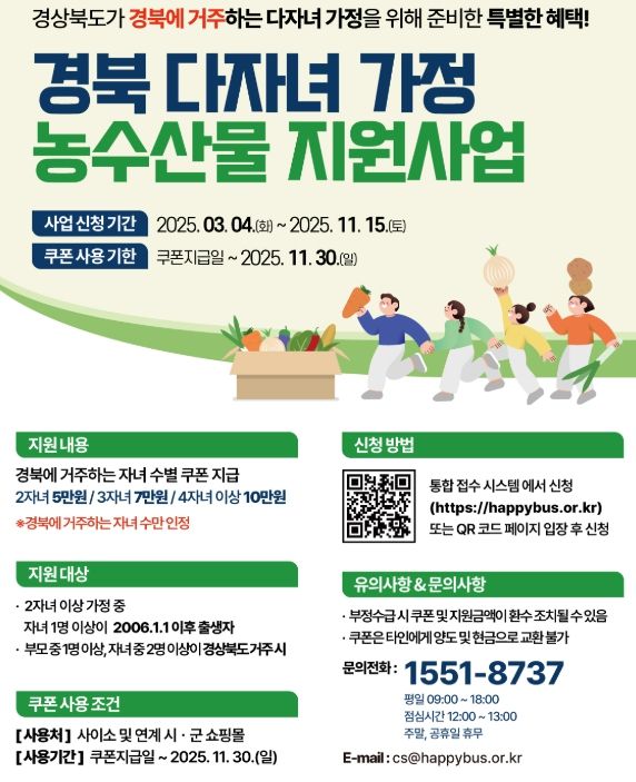 (아름다운교육신문) 경북 영주시는 다자녀 가정의 양육 부담을 줄이고 지역 농수산물 소비를 촉진하기 위해 오는 3월 4일부터 ‘다자녀가정 농수산물 구입 쿠폰 지원 사업’을 시행한다고 밝혔다.