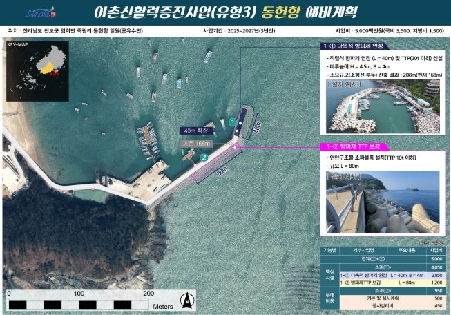 한편 진도군은 지난 2019년부터 ‘어촌뉴딜300사업’을 15개 어항에 총 668억 원을 투입해 추진하고 있고, ‘어촌신활력증진사업’은 이번에 선정된 1건(사업비 50억 원)을 포함해 2023년도 2건(사업비 100억 원), 2024년도 2건(사업비 350억 원), 총 500억 원을 확보해 추진 중이다.