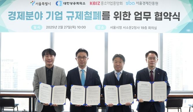 서울시는 2월 27일 오전 10시, 서울시청 서소문2청사에서 대한상공회의소, 중소기업중앙회, 서울경제진흥원 관계자 등 10여 명이 참석한 가운데, 서울기업 규제발굴・철폐를 위한 4자간 업무협약(MOU)을 체결했다고 밝혔다. 이날 협약식에는 주용태 서울시 경제실장, 이종명 대한상의 산업혁신본부장, 추문갑 중기중앙회 경제정책본부장, 김현우 SBA 대표이사 등이 참석했다.