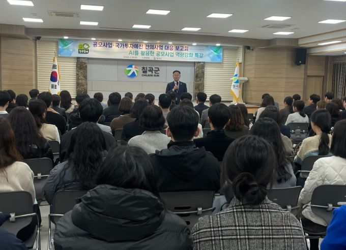 (아름다운교육신문) 칠곡군은 지난 26일 군청 강당에서‘공모사업 및 국가투자예산 건의사업 대응 보고회’와‘AI를 활용한 공모사업 기획 역량 향상 특강’을 개최했다.