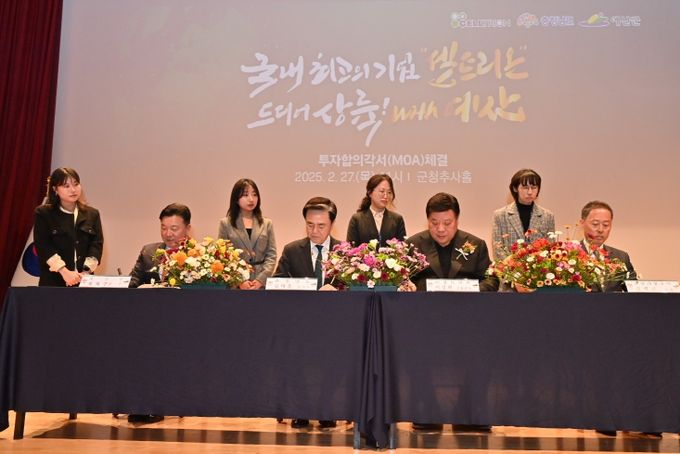 김태흠 지사는 27일 예산군청 추사홀에서 서정진 셀트리온그룹 회장, 최재구 예산군수, 김병곤 충남개발공사 사장과 투자합의각서(MOA)를 체결했다.