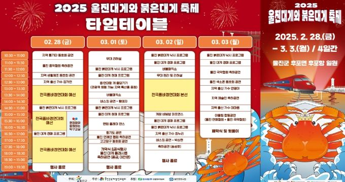 (아름다운교육신문) 울진군은 2월 28일부터 3월 3일까지 대게의 본고장 울진군 후포항 왕돌초광장 일원에서‘2025 울진대게와 붉은대게 축제’를 개최한다.