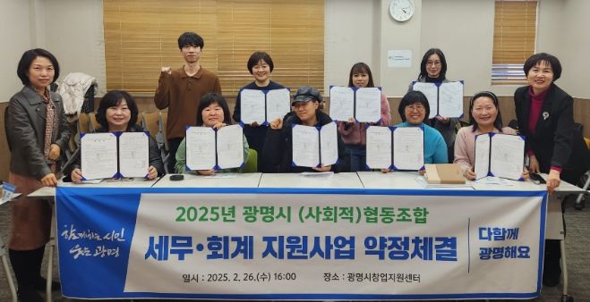 시는 지난 26일 광명시창업지원센터에서 사회적협동조합과 협동조합 8개 사와 세무·회계 기장 수수료 지원을 위한 약정 체결했다.