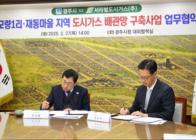 경주시와 서라벌도시가스㈜는 27일 시청 대외협력실에서 ‘모량1리‧재동마을 도시가스 배관망 구축사업 업무협약’을 체결했다.