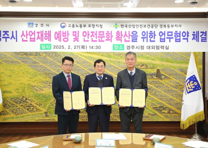 경주시, 고용노동부 포항지청, 안전보건공단 경북동부지사는 경주시청 대외협력실에서 27일 산업재해 예방 및 안전 문화 확산 업무협약을 체결했다.