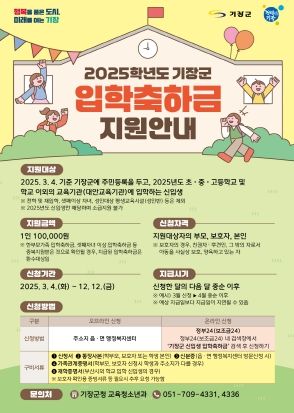 입학축하금 지원 대상은 2025년 3월 4일 기준으로 기장군에 주민등록이 되어 있으며, 초․중․고등학교 또는 대안교육기관에 입학하는 신입생이다.