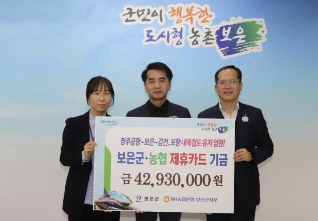 (아름다운교육신문) NH농협은행 보은군지부는 지난 27일 제휴카드 사용 적립기금 4,293만원을 보은군에 전달했다.