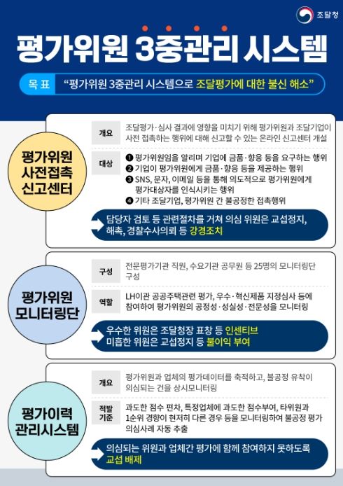 모니터링 결과 공정성, 성실성 각 평가항목 중 4개 이상 부적합 판정을 받은 평가위원은 교섭정지·해촉 등의 불이익 조치가 이루어진다. 반대로 우수한 평가위원에게는 조달청장 표창 등 인센티브가 제공된다.