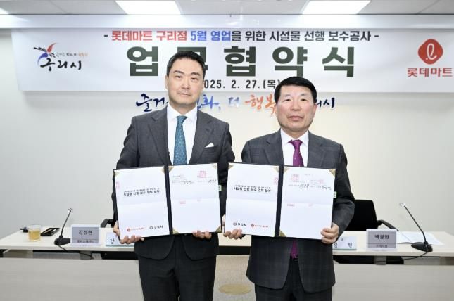(아름다운교육신문) 구리시는 ‘롯데마트 구리점 시설물 선행 보수 업무 협약 동의안’이 제345회 구리시의회 임시회에서 의결됨에 따라, 5월 말부터 영업이 가능하도록 롯데쇼핑 주식회사와 업무 협약을 지난 27일 체결했다고 밝혔다.